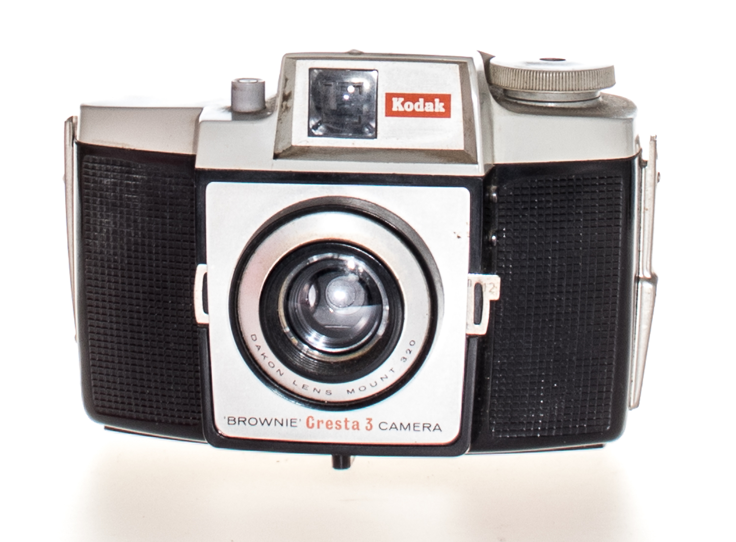 The Brownie Cresta 3 had the top changed to grey, with a “Kodak” label on an added panel beside the viewfinder and restyled lens surround. The Kodet lens was replaced with an f/11 Dakon with no close-up option; due to the increasing popularity of the colour film, the yellow filter was replaced by a second aperture stop. The apertures were labelled as 12 & 13, as Exposure Values. The viewfinder had marks for the new “Superslide” format.