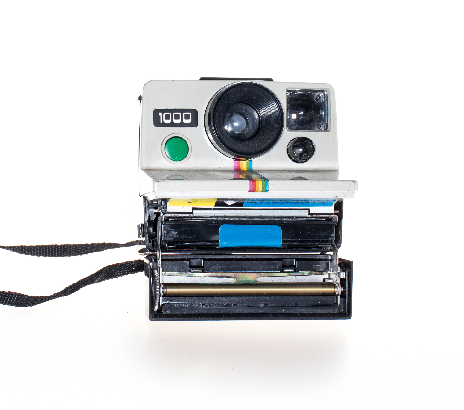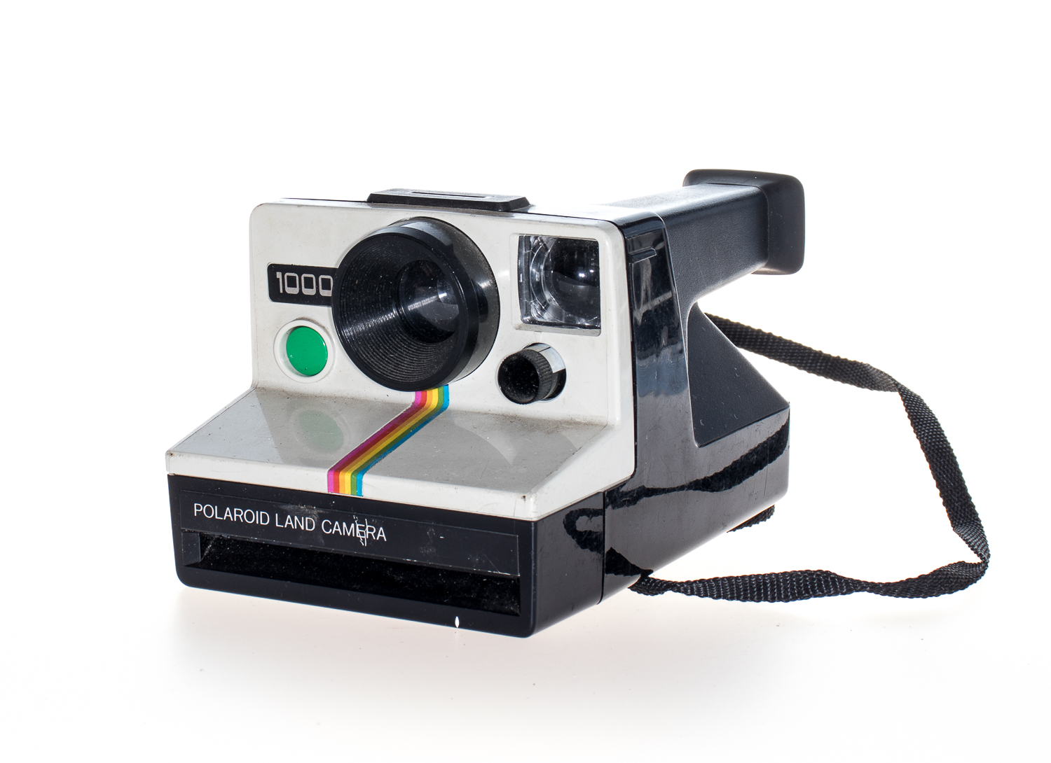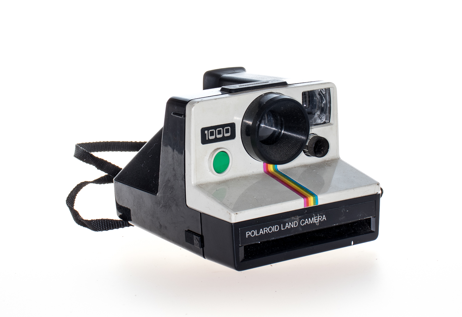 The Land Camera 1000 is a foreign-market version of the original Onestep model, meaning it has a fixed focus plastic lens. The model 1000 or original OneStep models are distinguished among the range. They were made available with 2 different coloured shutter buttons – either green or red; there is some debate among collectors as to which was more common. A matching electronic flash was also released for the Onestep/1000 model, known as the Q-Light. It fits onto any SX-70 non-folding camera model but was cosmetically matched to the original models. Features common to the series of OneStep non-folding, fixed-focus SX70-series integral film cameras are: